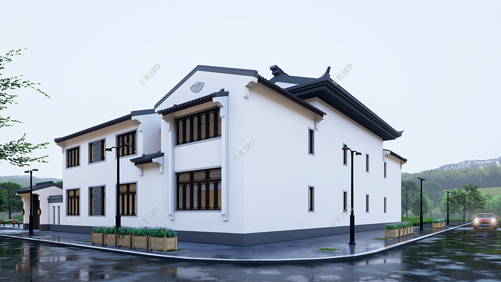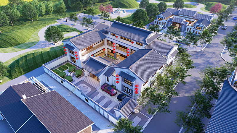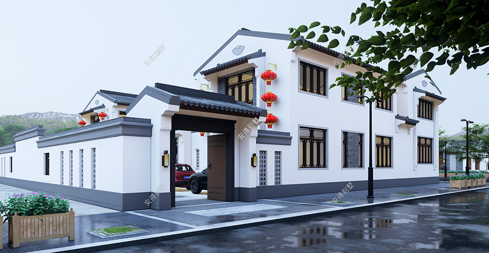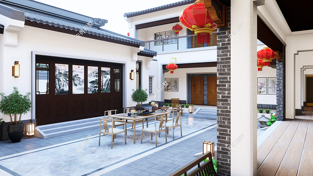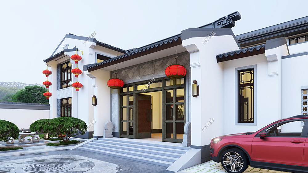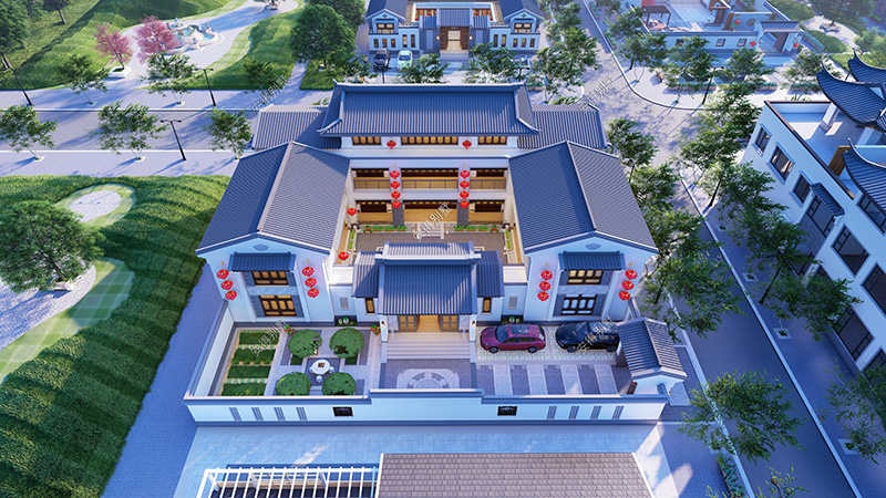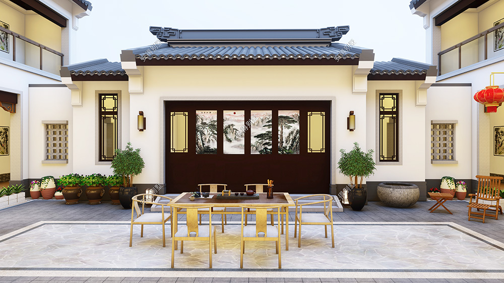 本栋四合院简洁大气,外观造型上没有复杂的装饰,通过屋顶的高差关系和形式的变化,让建筑赋有层次感和设计感。简易的二进式四合院,通过外墙和大门形成景观外庭院,内庭院为功能性休闲庭院。庭院美景沿着建筑中轴线层层递进,由外到内、从远到近,有序深入,犹如一幅幅生动的画卷徐徐展开,真正的诗意居住环境。